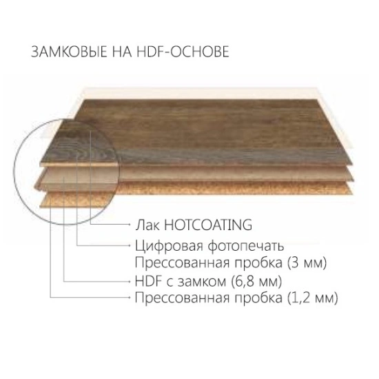 Пробковые замковые полы с фотопечатью на HDF-основе, 33-й класс износостойкости, замок Uniclick, лаковое покрытие HotCoating