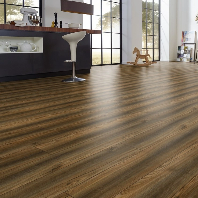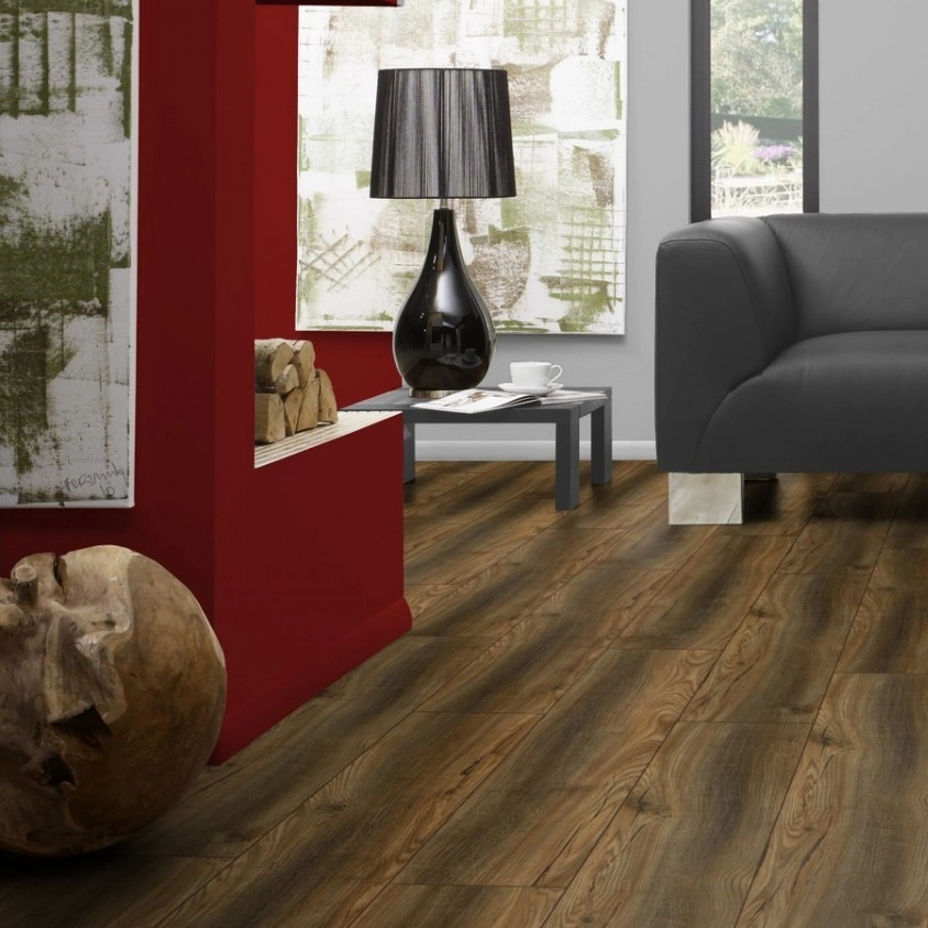 Имитация пола из массивной древесины. Благодаря ярко выраженной текстуре натурального дерева и за счёт V-образного паза панели выглядят естественно и практически неотличимыми от старых добрых половиц