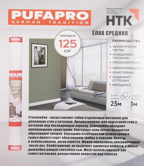 Обои стеклотканевые, плотность 125 гр/кв.м., полезная площадь 25 кв.м.